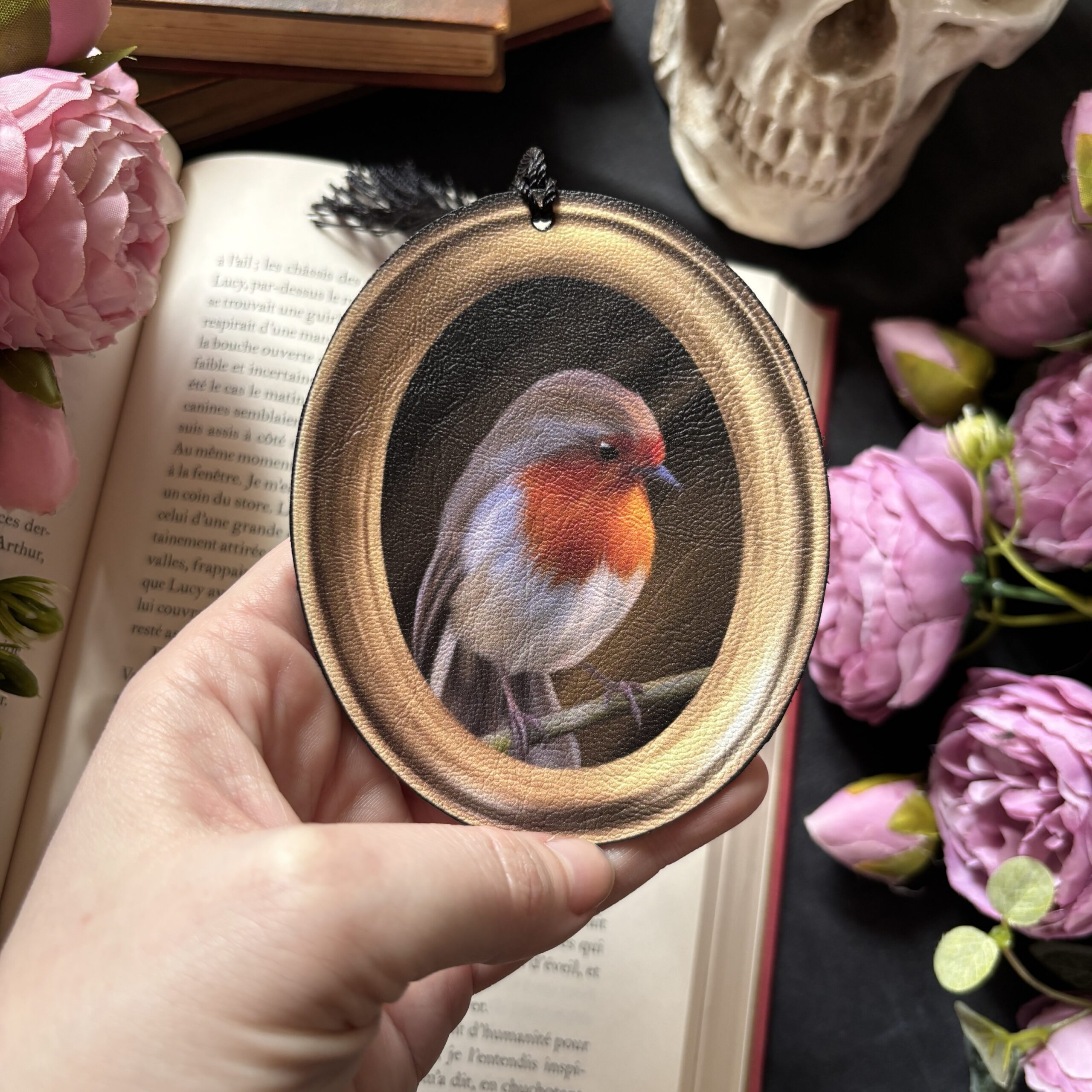 Le rouge gorge. Marque page, décoration tableau d’oiseau. Tissu simili cuir
